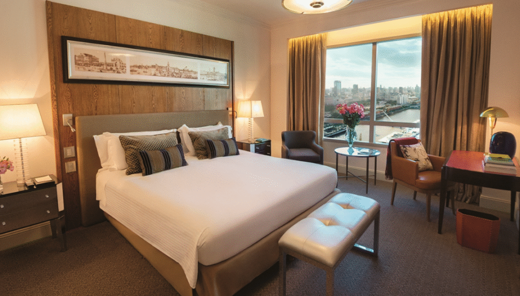 De lyse, rummelige og elegant indrettede værelser har panoramaudsigt over floden eller byens skyline og er udstyret med moderne bekvemmeligheder som marmorbadeværelser, Nespresso-maskiner, luksussengetøj og smart-tv. Gæsterne har adgang til hotellets spa- og wellnesscenter med indendørs pool, fitnesscenter, sauna og behandlingsrum.